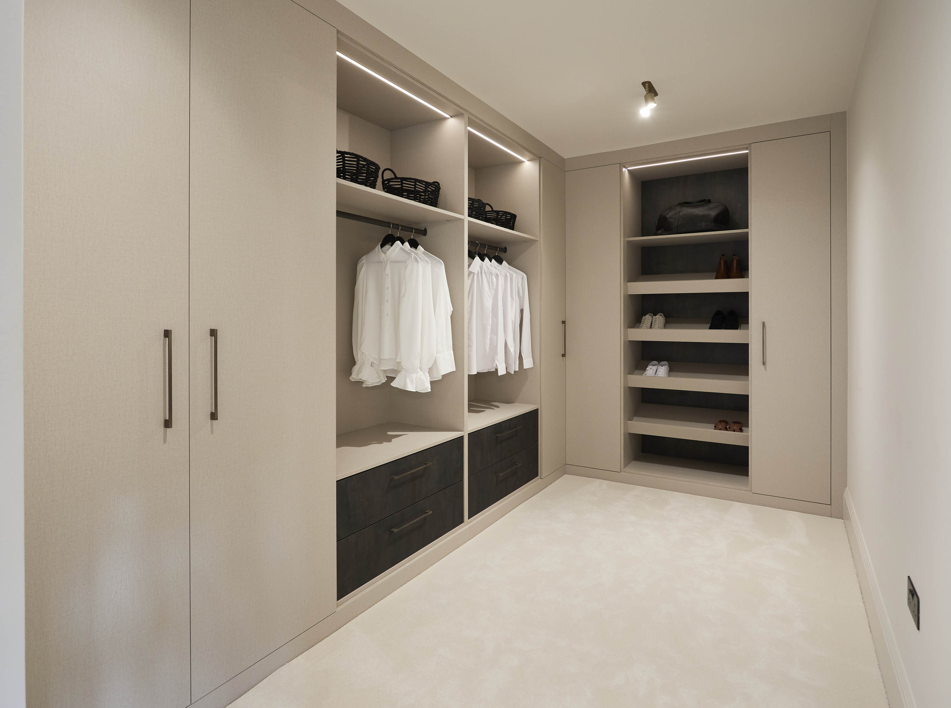 Creating a bespoke fitted wardrobe is the perfect way to maximise the usable space in your room, and to enhance the practicality and enjoyable aspect of your daily dressing routine. Interior organisers can provide storage solutions for your fitted wardrobe that help keep your bedroom decluttered and well-organised. You’ll have space to keep everything separate and arrange your clothes practically and aesthetically, according to your preferences.