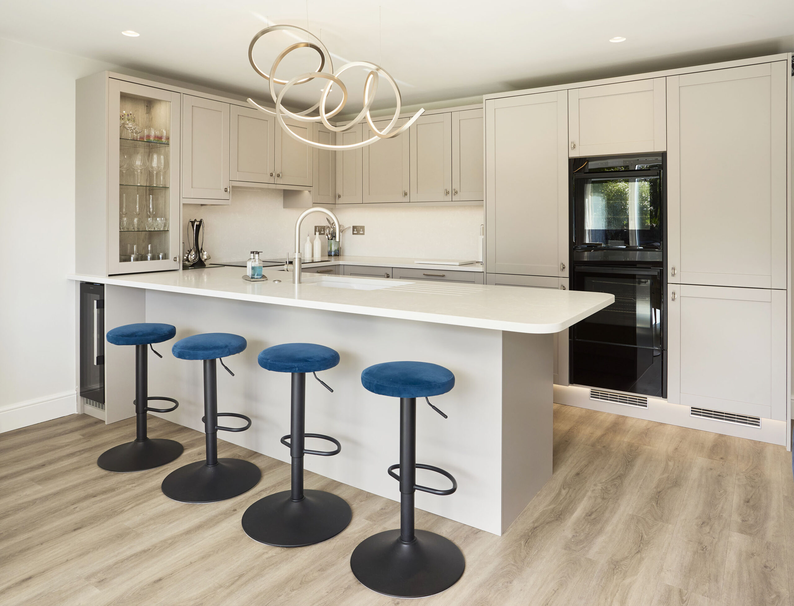This Monarch shaker-style kitchen, painted in a soft Pebble, blends classic charm with smart, contemporary design. It features luxurious Quartz worktops, a venting hob, and a sleek Quooker tap. Thoughtfully designed with ample storage, the space is beautifully lit by a statement pendant light, creating a warm and inviting atmosphere. For more of our recent projects please visit our kitchen project page.