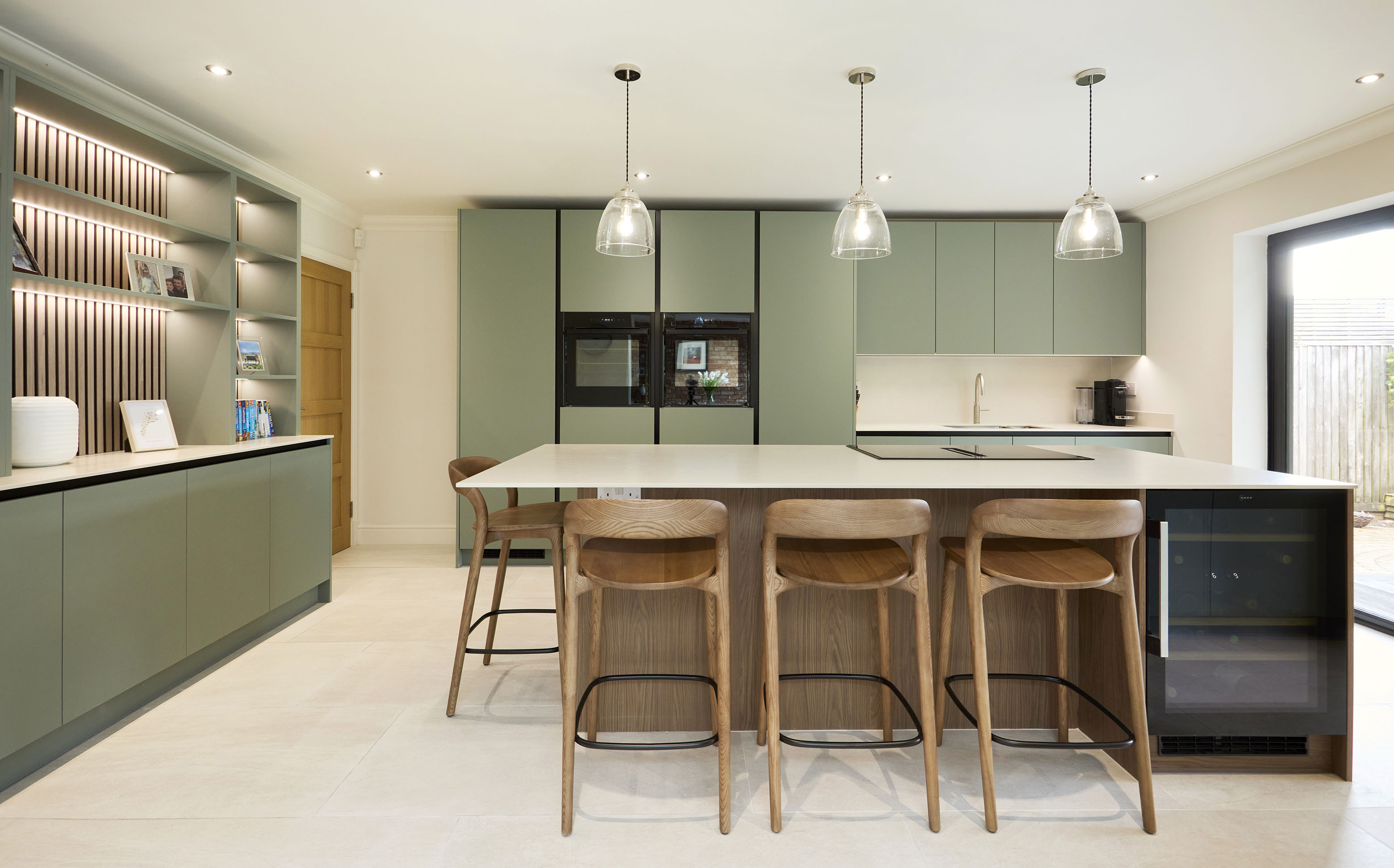 This contemporary kitchen pairs calming Pure Jade cabinetry with the warmth of Dark Oak, creating a refined yet inviting space. Clean handleless lines, integrated appliances and a generous island with oak detailing bring both practicality and elegance, while soft lighting enhances the serene colour palette. A matching utility room continues the design seamlessly, delivering a cohesive and highly functional solution throughout the home. For more of our recent projects please visit our kitchen project page.