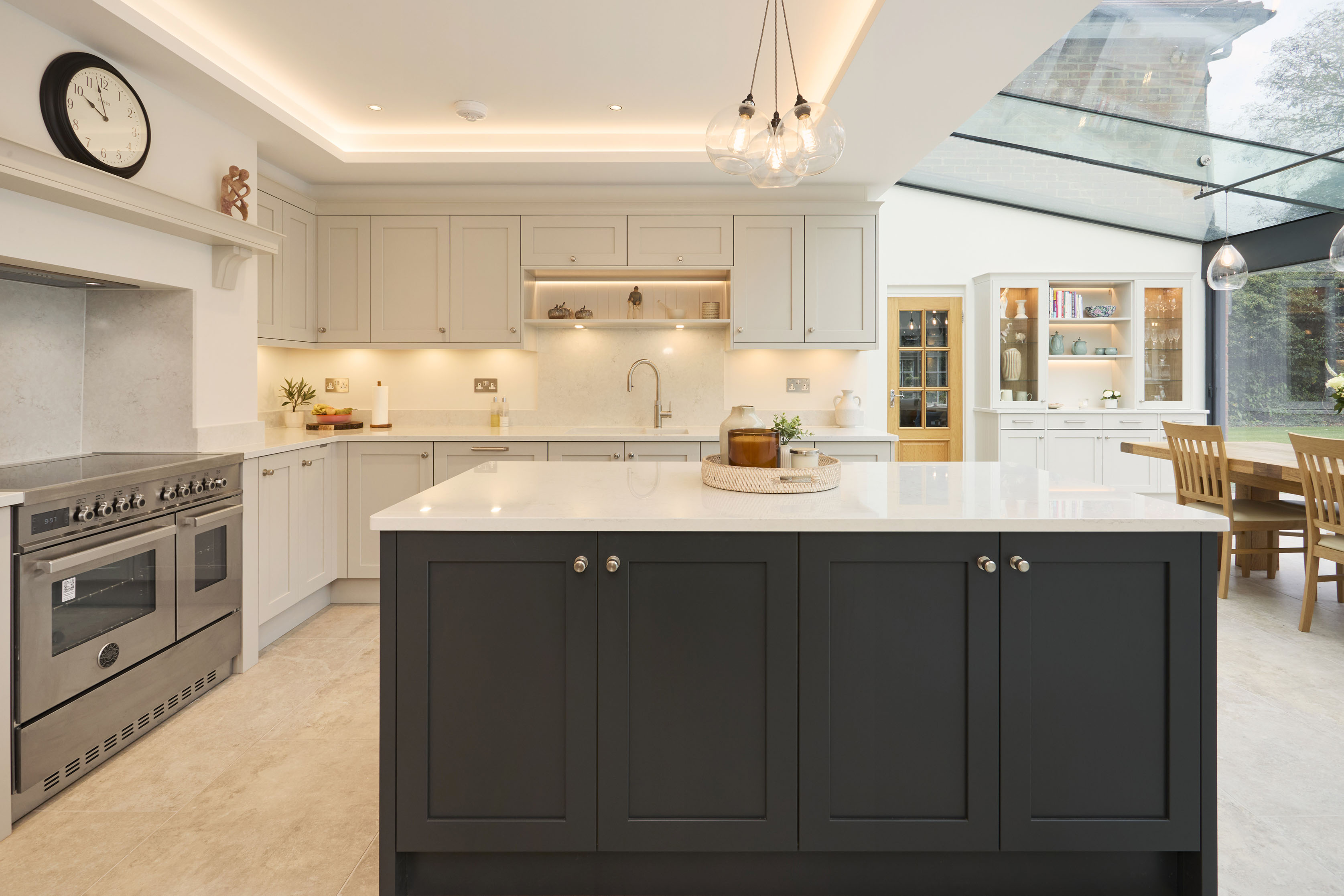 Step into this beautifully crafted kitchen, where classic design meets contemporary elegance. Perfect for family life and entertaining, this space is as practical as it is stylish. The adjoining utility room continues the cohesive look with matching Painted Limestone cabinets, creating a smooth transition and adding valuable functionality. At the heart of the kitchen is a striking island finished in Painted Anthracite, offering generous storage and a spacious worktop for food preparation or casual dining. Paired with luxurious quartz surfaces, this combination delivers durability and a premium finish that elevates the entire design. Every detail has been carefully considered, from integrated appliances that maintain a sleek, uncluttered aesthetic to elegant pendant lighting that adds warmth and character. The layout ensures an effortless workflow, making cooking and hosting a true pleasure. This kitchen is more than a place to cook; it’s a hub for everyday living. For more of our recent projects please visit our kitchen project page.