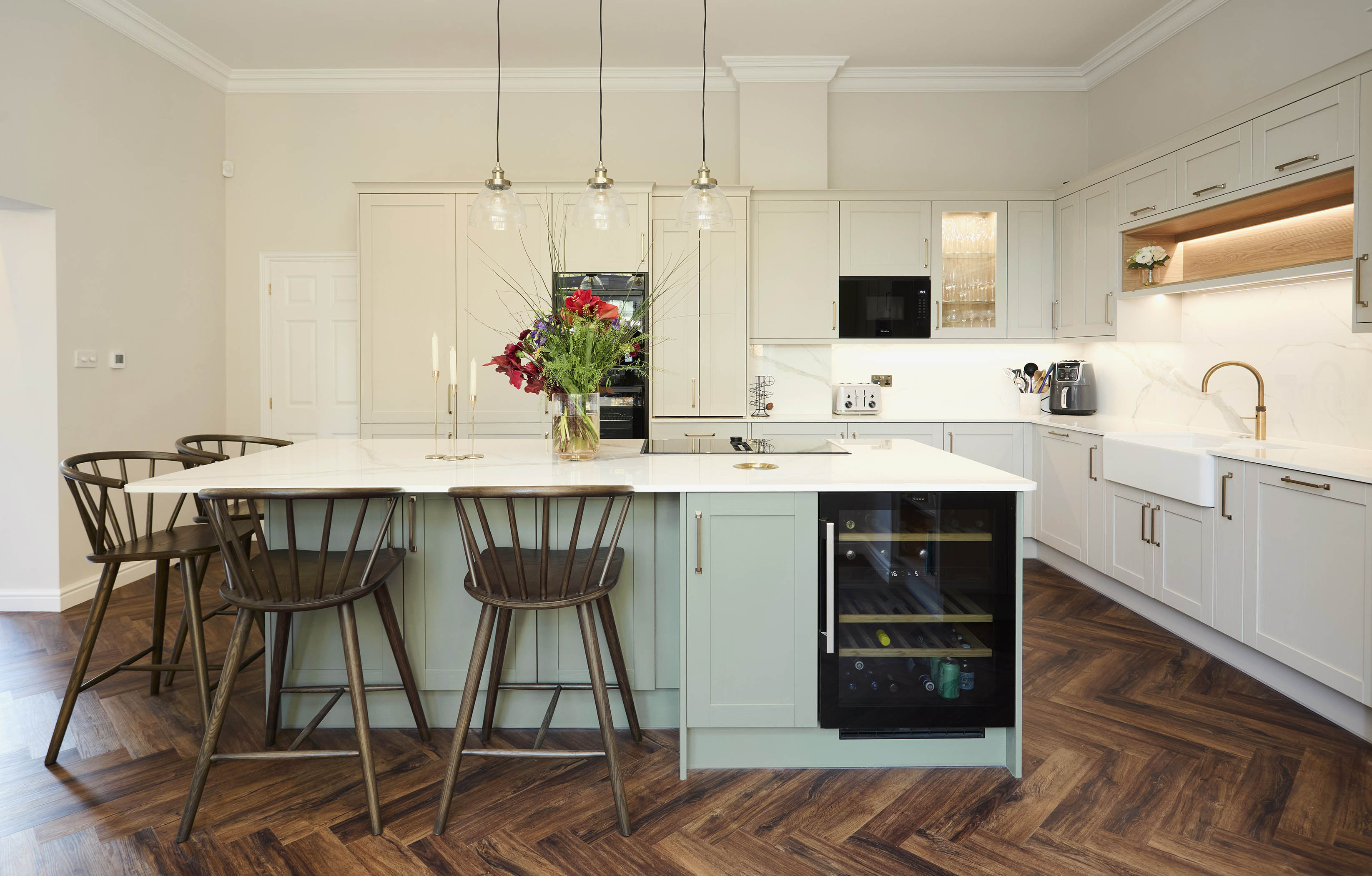This stunning kitchen combines timeless elegance with modern functionality. At its heart is a spacious, custom-built island in a soft Jade finish, complete with an integrated wine cooler and stylish seating for four; it creates the perfect hub for entertaining and family life. The shaker-style cabinetry in a neutral Limestone pairs beautifully with luxurious quartz worktops, creating a refined and cohesive look. Every element, from precision-fitted brass handles to illuminated shelving, reflects the attention to detail that defines our tailored kitchen designs. Thoughtfully planned storage solutions ensure practicality without compromising the minimalist, chic aesthetic. For more of our recent projects please visit our kitchen project page.