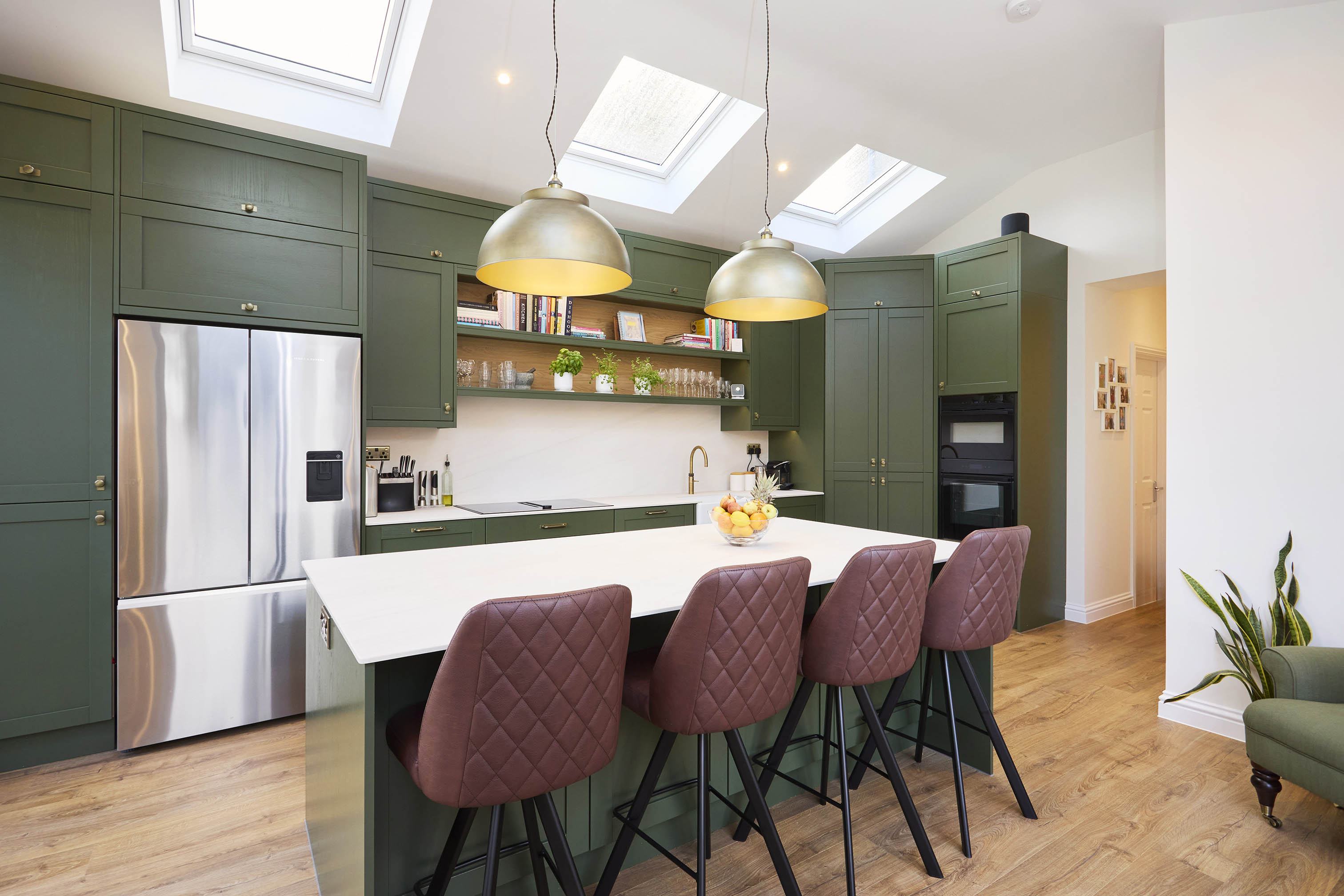This beautiful kitchen combines timeless craftsmanship with contemporary living, featuring Sovereign cabinetry painted in Fern for a rich, elegant finish. The deep green tones are perfectly balanced by sleek porcelain worktops, offering a crisp, durable surface ideal for everyday use. A generous island, warm timber flooring and statement lighting create a welcoming focal point, while the overall design delivers a refined yet relaxed space suited to modern family life. For more of our recent projects please visit our kitchen project page.